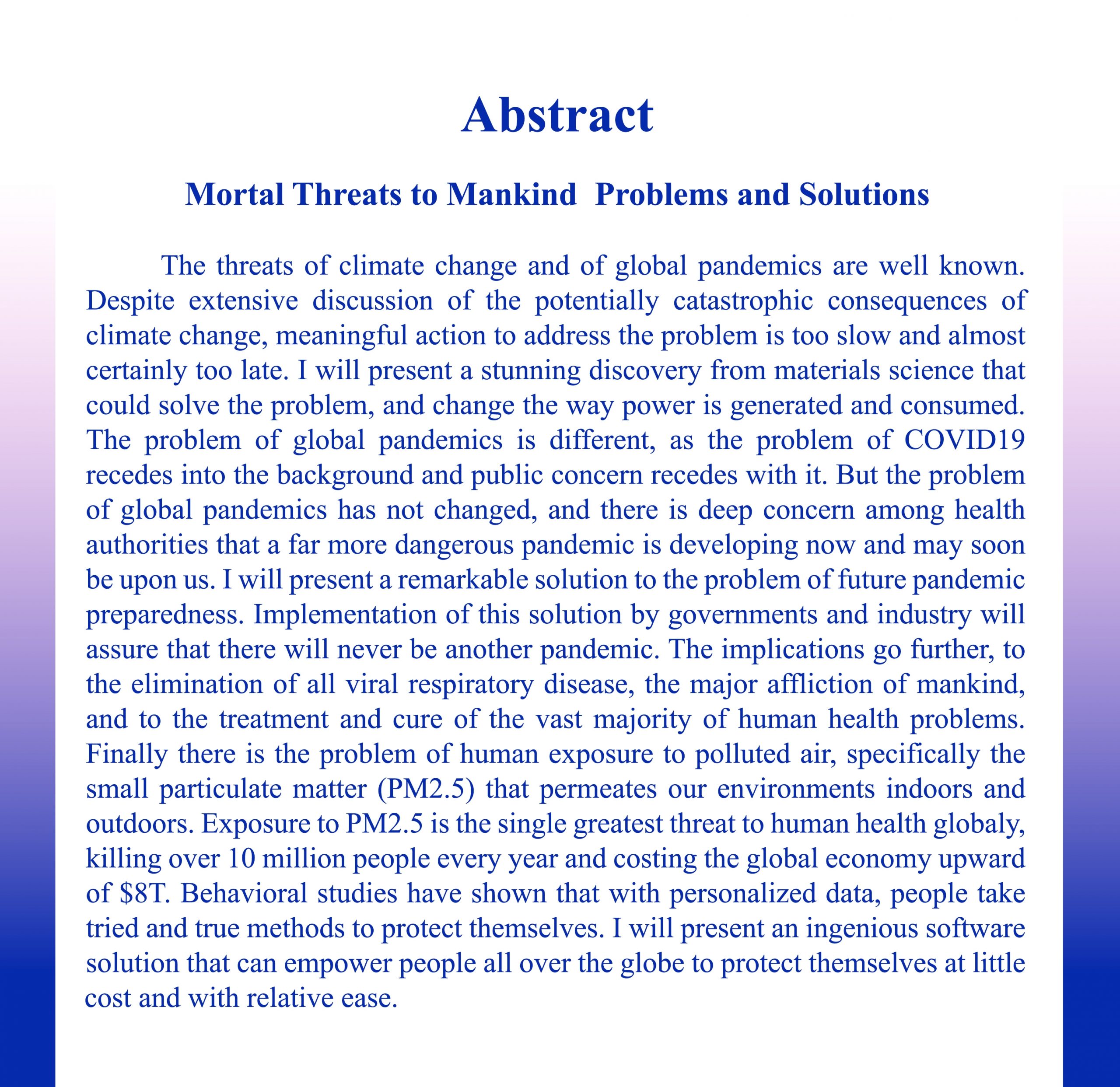 The threats of climate change and of global pandemics are well known. Despite extensive discussion of the potentially catastrophic consequences of climate change, meaningful action to address the problem is too slow and almost certainly too late. I will present a stunning discovery from materials science that could solve the problem, and change the way power is generated and consumed. The problem of global pandemics is different, as the problem of COVID19 recedes into the background and public concern recedes with it. But the problem of global pandemics has not changed, and there is deep concern among health authorities that a far more dangerous pandemic is developing now and may soon be upon us. I will present a remarkable solution to the problem of future pandemic preparedness. Implementation of this solution by governments and industry will assure that there will never be another pandemic. The implications go further, to the elimination of all viral respiratory disease, the major affliction of mankind, and to the treatment and cure of the vast majority of human health problems. Finally there is the problem of human exposure to polluted air, specifically the small particulate matter (PM2.5) that permeates our environments indoors and outdoors. Exposure to PM2.5 is the single greatest threat to human health globally, killing over 10 million people every year and costing the global economy upward of $8T. Behavioral studies have shown that with personalized data, people take tried and true methods to protect themselves. I will present an ingenious software solution that can empower people all over the globe to protect themselves at little cost and with relative ease.