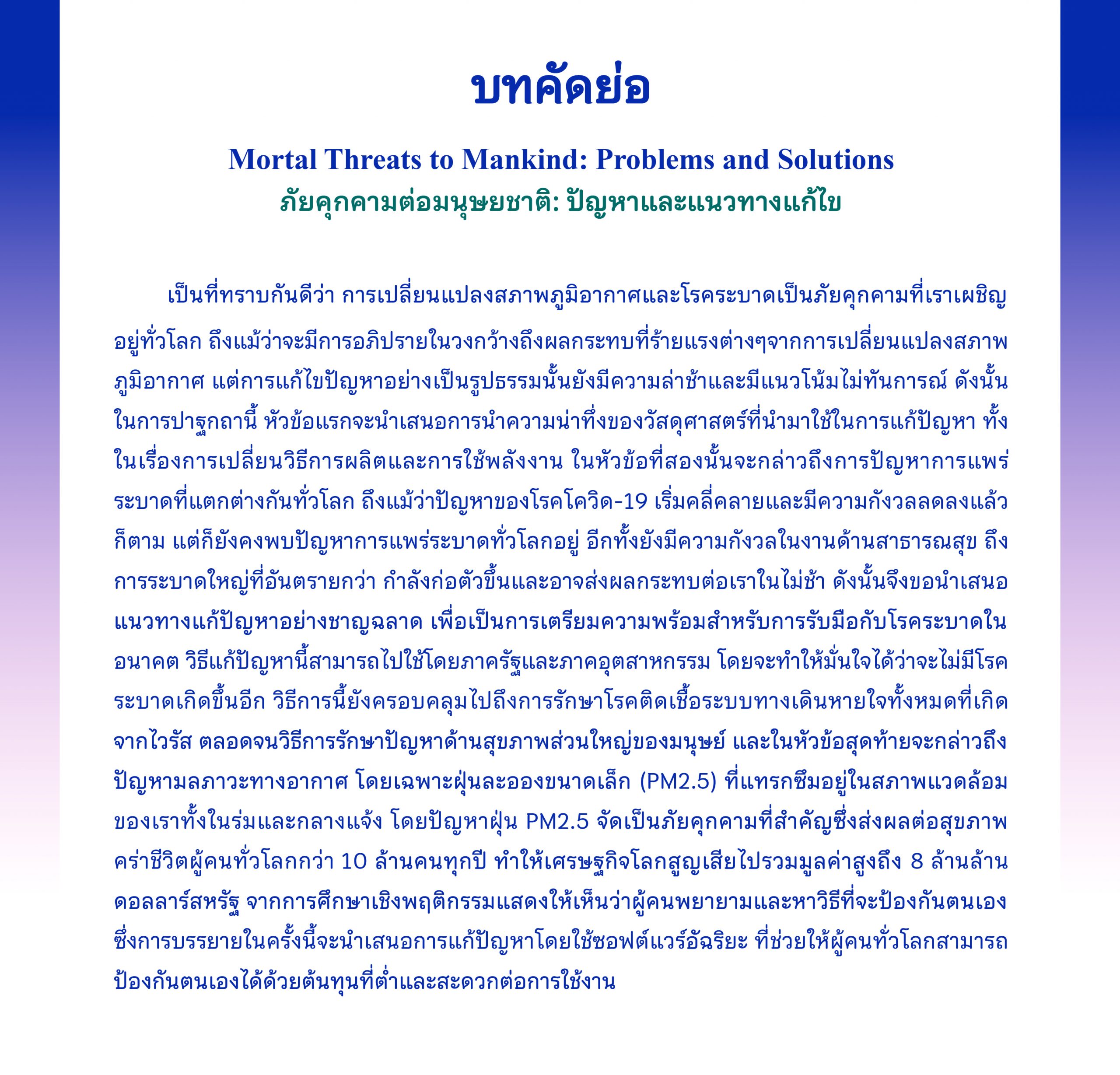 เป็นที่ทราบกันดีว่า การเปลี่ยนแปลงสภาพภูมิอากาศและโรคระบาดเป็นภัยคุกคามที่เราเผชิญอยู่ทั่วโลก ถึงแม้ว่าจะมีการอภิปรายในวงกว้างถึงผลกระทบที่ร้ายแรงต่างๆจากการเปลี่ยนแปลงสภาพภูมิอากาศ แต่การแก้ไขปัญหาอย่างเป็นรูปธรรมนั้นยังมีความล่าช้าและมีแนวโน้มไม่ทันการณ์ ดังนั้นในการปาฐกถานี้ หัวข้อแรกจะนำเสนอการนำความน่าทึ่งของวัสดุศาสตร์ที่นำมาใช้ในการแก้ปัญหา ทั้งในเรื่องการเปลี่ยนวิธีการผลิตและการใช้พลังงาน ในหัวข้อที่สองนั้นจะกล่าวถึงการปัญหาการแพร่ระบาดที่แตกต่างกันทั่วโลก ถึงแม้ว่าปัญหาของโรคโควิด-19 เริ่มคลี่คลายและมีความกังวลลดลงแล้วก็ตาม แต่ก็ยังคงพบปัญหาการแพร่ระบาดทั่วโลกอยู่ อีกทั้งยังมีความกังวลในงานด้านสาธารณสุข ถึงการระบาดใหญ่ที่อันตรายกว่า กำลังก่อตัวขึ้นและอาจส่งผลกระทบต่อเราในไม่ช้า ดังนั้นจึงขอนำเสนอแนวทางแก้ปัญหาอย่างชาญฉลาด เพื่อเป็นการเตรียมความพร้อมสำหรับการรับมือกับโรคระบาดในอนาคต วิธีแก้ปัญหานี้สามารถไปใช้โดยภาครัฐและภาคอุตสาหกรรม โดยจะทำให้มั่นใจได้ว่าจะไม่มีโรคระบาดเกิดขึ้นอีก วิธีการนี้ยังครอบคลุมไปถึงการรักษาโรคติดเชื้อระบบทางเดินหายใจทั้งหมดที่เกิดจากไวรัส ตลอดจนวิธีการรักษาปัญหาด้านสุขภาพส่วนใหญ่ของมนุษย์ และในหัวข้อสุดท้ายจะกล่าวถึงปัญหามลภาวะทางอากาศ โดยเฉพาะฝุ่นละอองขนาดเล็ก (PM2.5) ที่แทรกซึมอยู่ในสภาพแวดล้อมของเราทั้งในร่มและกลางแจ้ง โดยปัญหาฝุ่น PM2.5 จัดเป็นภัยคุกคามที่สำคัญซึ่งส่งผลต่อสุขภาพ คร่าชีวิตผู้คนทั่วโลกกว่า 10 ล้านคนทุกปี ทำให้เศรษฐกิจโลกสูญเสียไปรวมมูลค่าสูงถึง 8 ล้านล้านดอลลาร์สหรัฐ จากการศึกษาเชิงพฤติกรรมแสดงให้เห็นว่าผู้คนพยายามและหาวิธีที่จะป้องกันตนเอง ซึ่งการบรรยายในครั้งนี้จะนำเสนอการแก้ปัญหาโดยใช้ซอฟต์แวร์อัฉริยะ ที่ช่วยให้ผู้คนทั่วโลกสามารถป้องกันตนเองได้ด้วยต้นทุนที่ต่ำและสะดวกต่อการใช้งาน