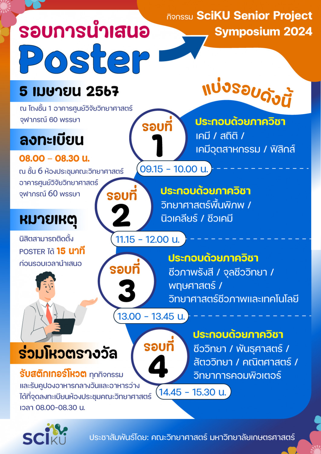 ðĢāļāļāđāļāļīāļāđāļāđāļēāļĢāđāļ§āļĄāļāļēāļĢāļāļģāđāļŠāļāļāļāļēāļāļ§āļīāļāļąāļĒāđāļāļ Poster āļāļāļāļāļīāļŠāļīāļāļāļąāđāļāļāļĩāļāļĩāđ 4 āđāļāļāļīāļāļāļĢāļĢāļĄ SciKU Senior Project Symposium 2024 āļ āđāļāļāļāļąāđāļ 1 āļāļēāļāļēāļĢāļĻāļđāļāļĒāđāļ§āļīāļāļąāļĒāļ§āļīāļāļĒāļēāļĻāļēāļŠāļāļĢāđāļāļļāļŽāļēāļ āļĢāļāđ 60 āļāļĢāļĢāļĐāļē